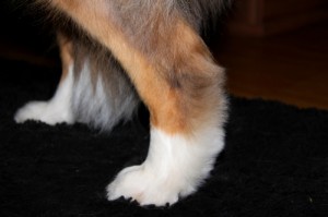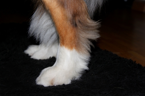 Die Befederung an den Hacken wird auf eine Länge gebracht und leicht (!) gekürzt. Wie viel hier entfernt wird, sollte je nach Situation entschieden werden. Möchte ich meinen Aussie für eine Ausstellung groomen, bringe ich die Befederung auf eine Länge und je nach Länge kürze ich ein wenig. Bitte nicht zu viel entfernen, die Befederung an den Hacken sollte nicht so kurz sein wie das restliche Fell am Fuss. Wenn ich die Hackenbefederung vor allem für den Alltag groomen möchte, dann kann natürlich gern etwas mehr ab. Das ist praktischer und so wird weniger Schmutz mit in die Wohnung getragen.