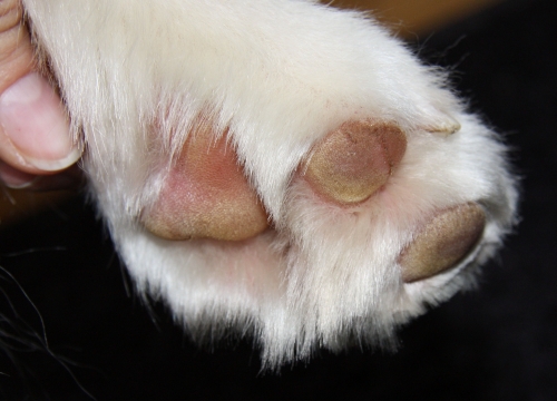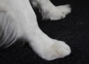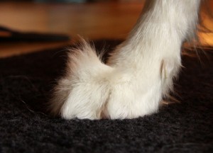 Unter den Pfoten werden überstehende Haare zwischen den Ballen gekürzt. Das geht sehr gut mit einer gerundeten Pfotenschere, aber auch mit einer normalen Fellschere. Ich rasiere das Fell unter den Pfoten mit einem elektrischen Rasierapparat ab, das geht schneller. Die Hunde sollten das allerdings gewohnt sein und nicht gestresst auf den Rasierer reagieren.
