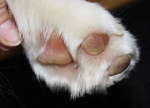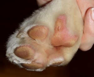 Beginnen wir mit den Pfoten. Hier benötigen wir die Slicker brush, die Effilierschere und die Pfotenschere. Wir beginnen damit die Haare auf den Pfoten mit der Slickerbrush entgegen der Wuchsrichtung zu kämmen, das holt die langen Haare zwischen den Zehen hervor. Diese Haare werden mit der Effilierschere gekürzt. Das wird mit allen abstehenden langen Haaren an jeder Pfote wiederholt.