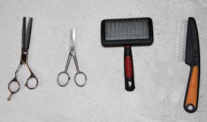 Von links nach rechts: Effilierschere, Pfotenschere (alternativ auch normale Fellschere), Slicker Brush, Kamm für Unterwolle – mehr benötige ich für ein ‘trockenes’ Grooming nicht.